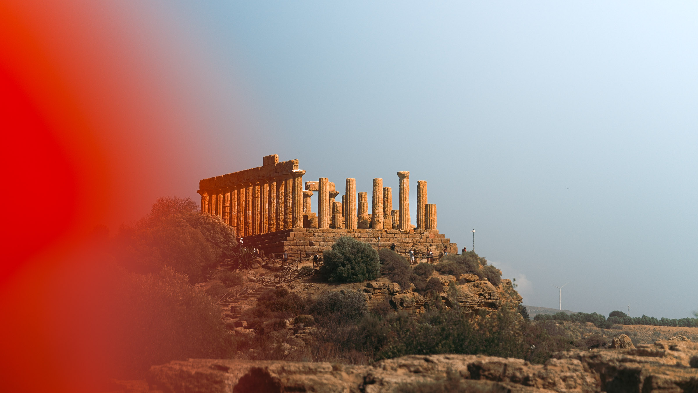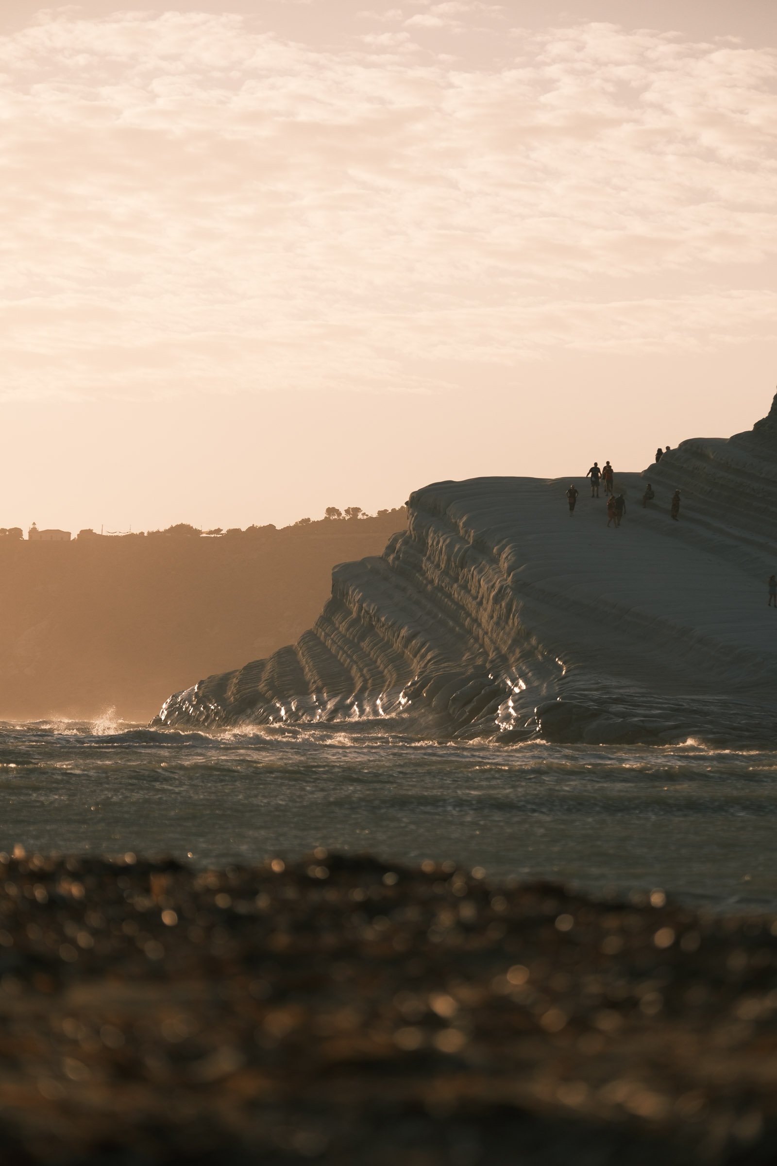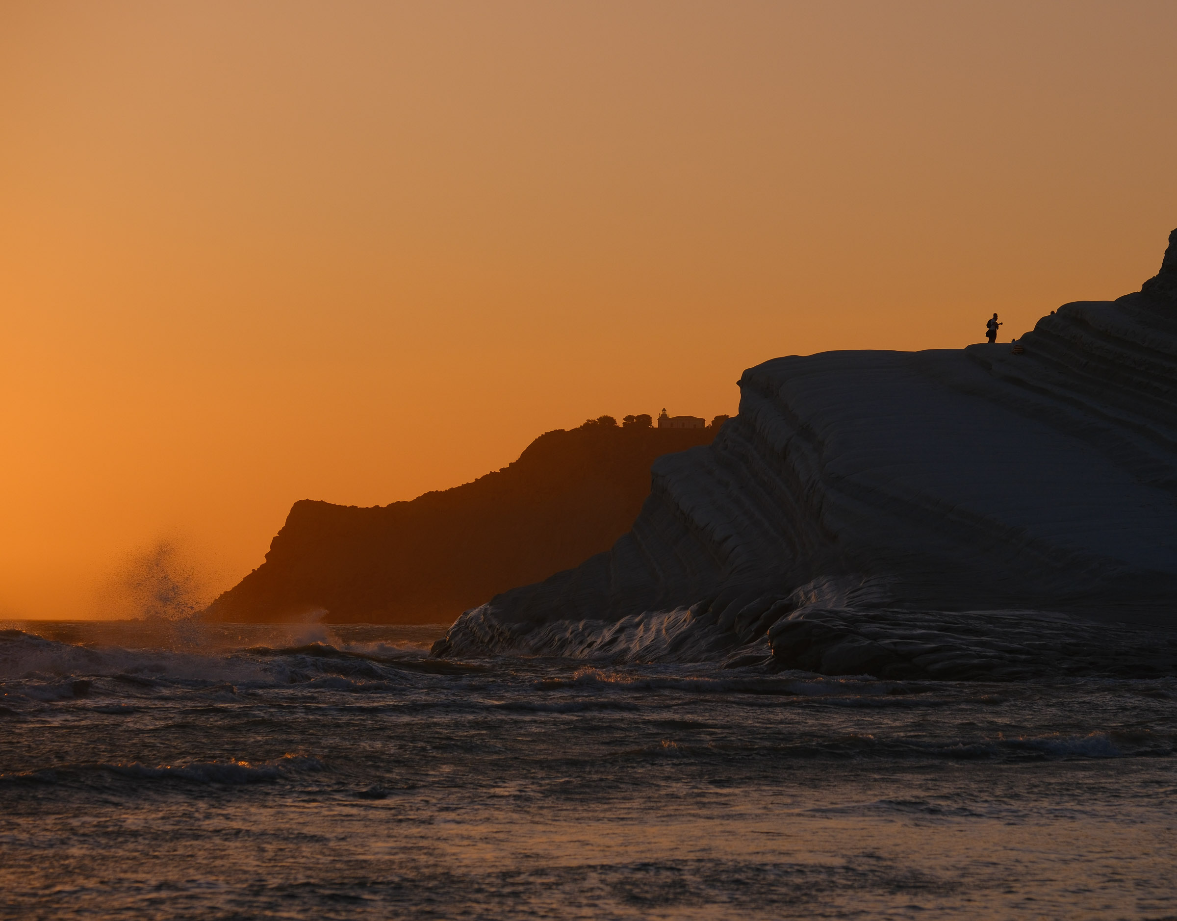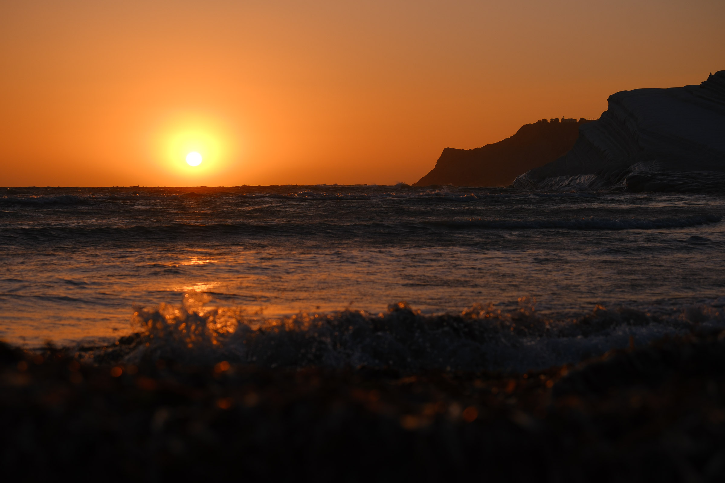 Entre Cefalù et Agrigente, les falaises tombent dans la mer et le soleil finit en rouge. Le vent souffle fort. Il n'y a pas grand monde.